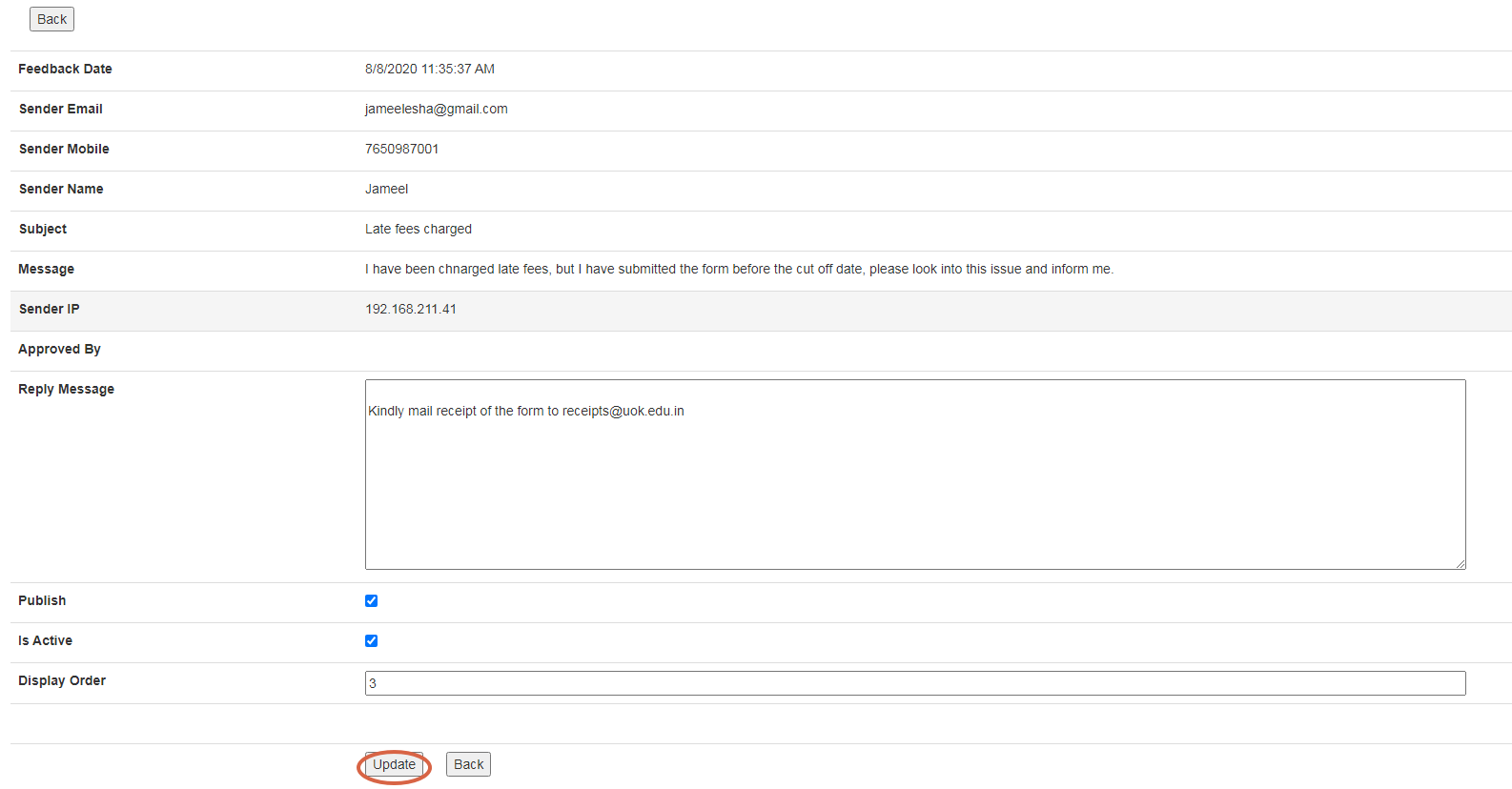 In this section of content Management System, the user can see, reply and publish feedback that has been submitted by the student on the website.