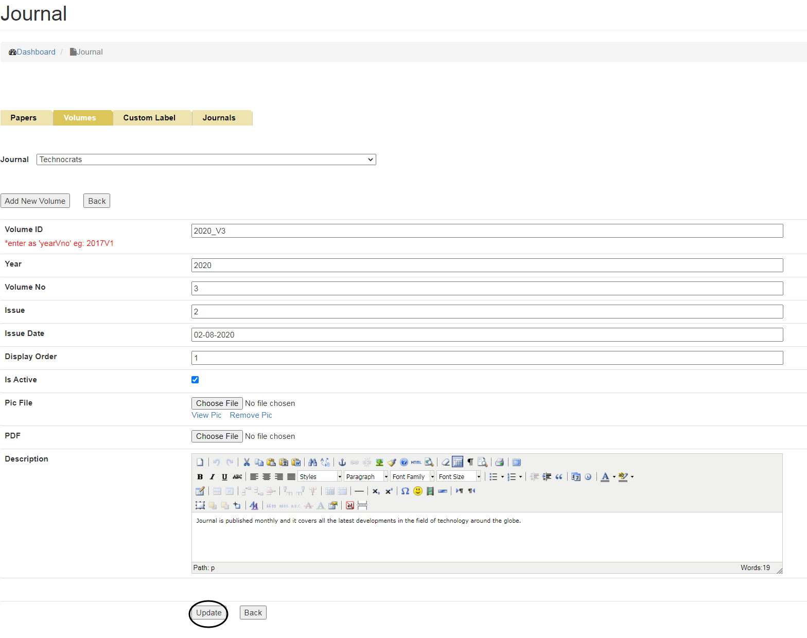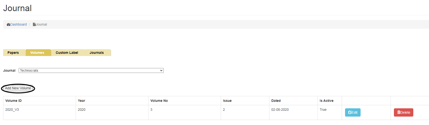 To Add New Volumes, click on Volumes tab and select the Journal name from the drop down menu for which you want to add Volume.