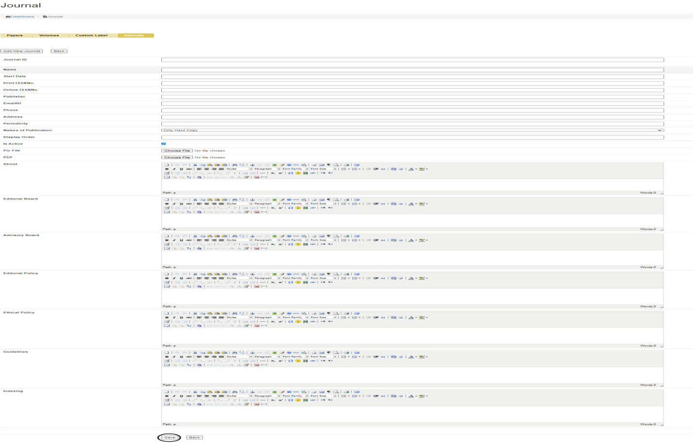 After clicking on Add new journal tab, it will take you to the page wherein you can enter all the details related to Journal which includes: