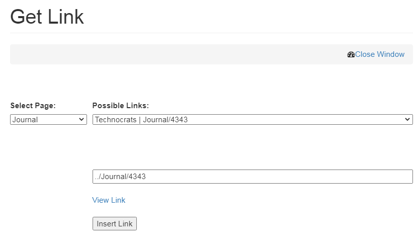 • Click on Get Local link, select Journal from the Select Page drop down menu, choose Journal name from Possible Links and click on Insert Link.