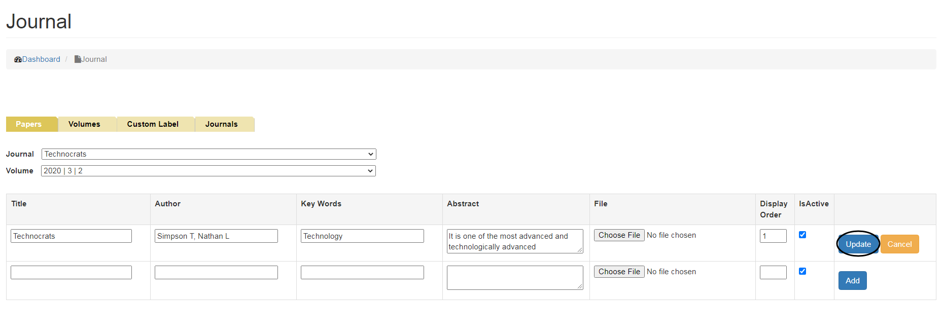 Next step is to add Papers, Click on Papers tab and select Journal and Volume from the drop down menu. Enter relevant details and click on Add button.
